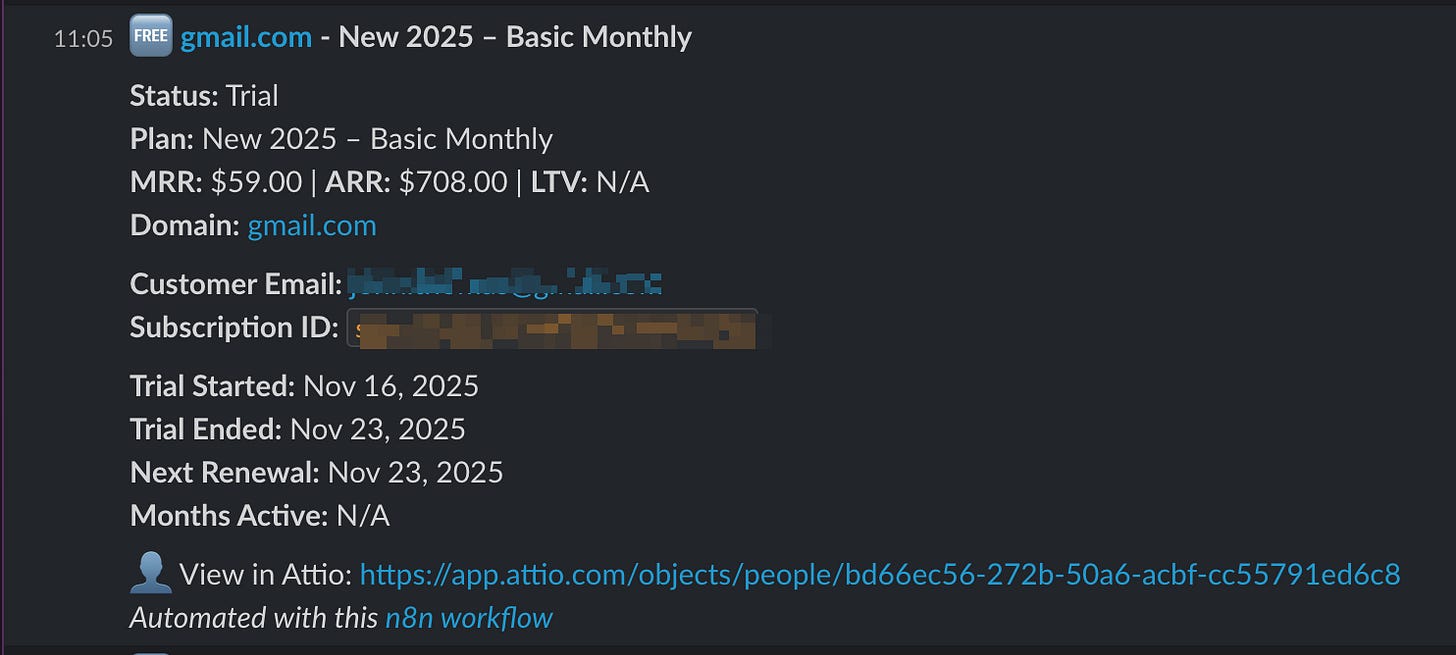 Surprisingly, there isn’t a convenient native Attio–Stripe integration (at least at the time of writing), so we used n8n + Stripe webhooks + Attio API.