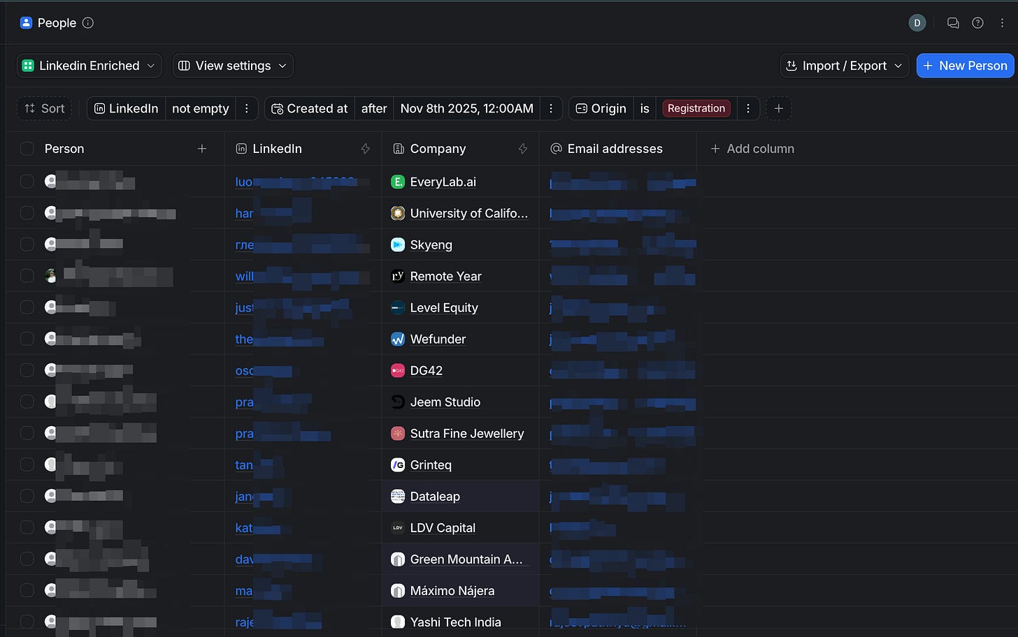 The outcome: for every person registered in the product, we try to turn them into “Person X at Company Y with role Z”—complete with their corporate email and LinkedIn profile—not just “John from Gmail”.
