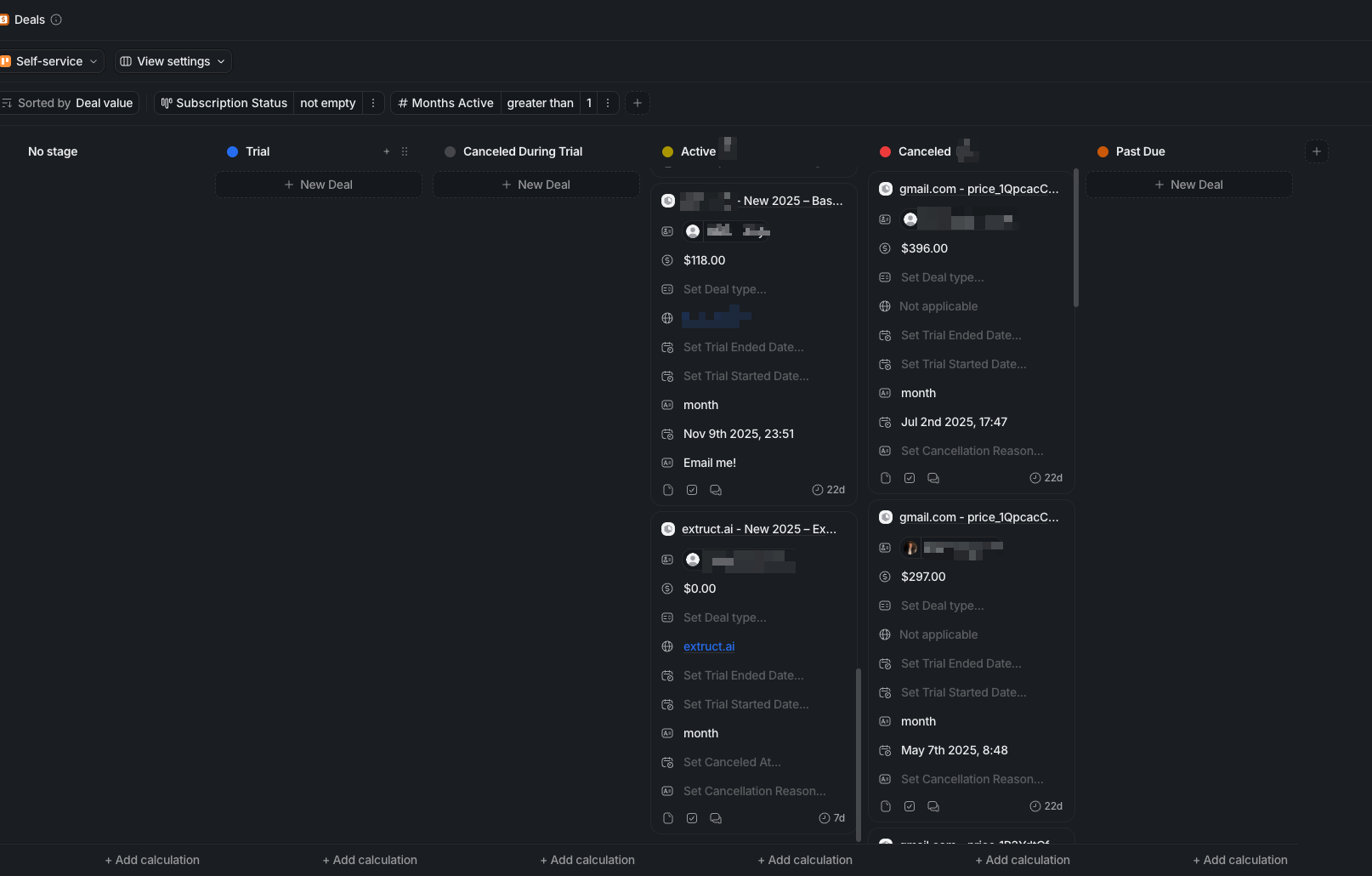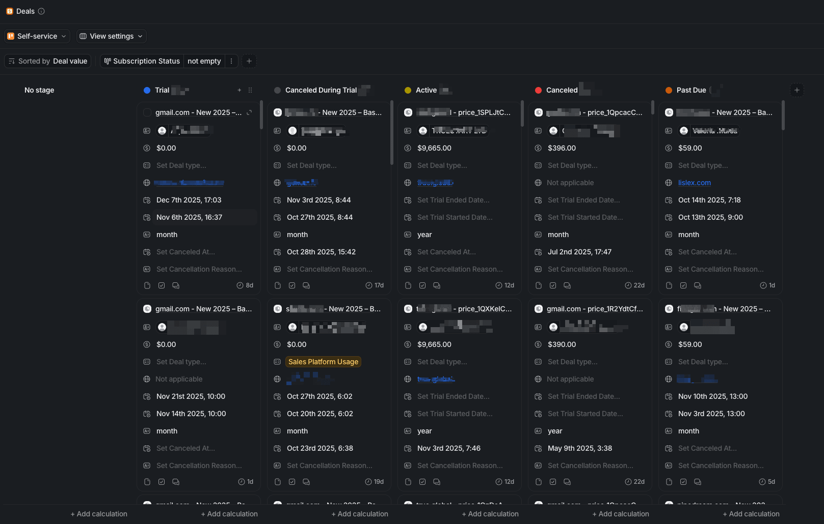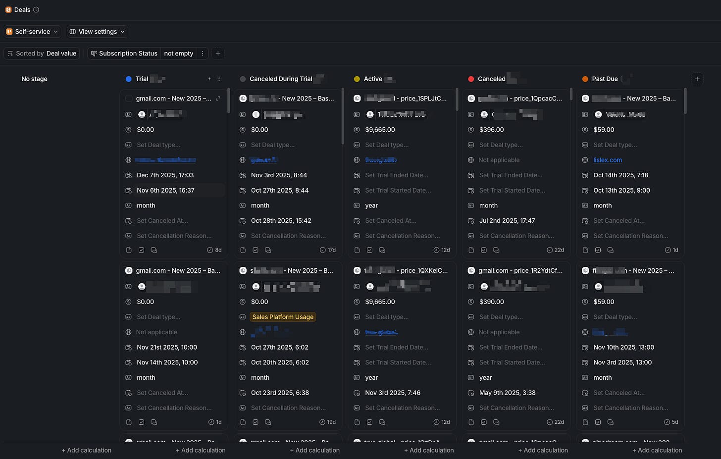 For every subscription stage, we have the corresponding stage in the Self-service Deal Pipeline. For us, the deal approach works because we care about how many customers are in trial / first month/expansion.
